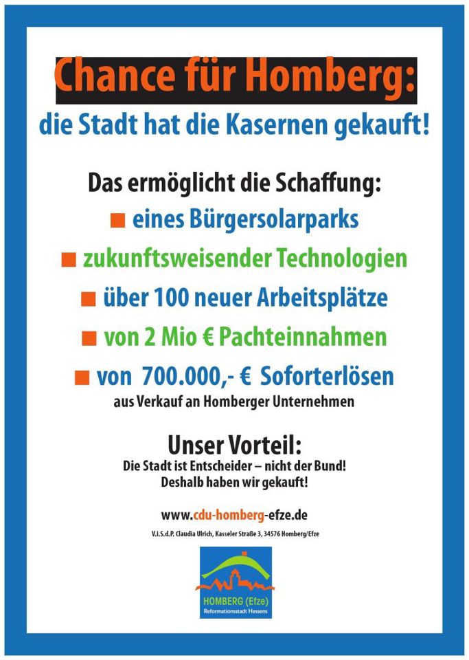 Mit einem Kommentar ihres Fraktionsvorsitzenden und einer Plakataktion wirbt die Homberger CDU dafür, das Bürgerbegehren gegen den Ankauf der ehemaligen Kasernenflächen nicht zu unterstützen.