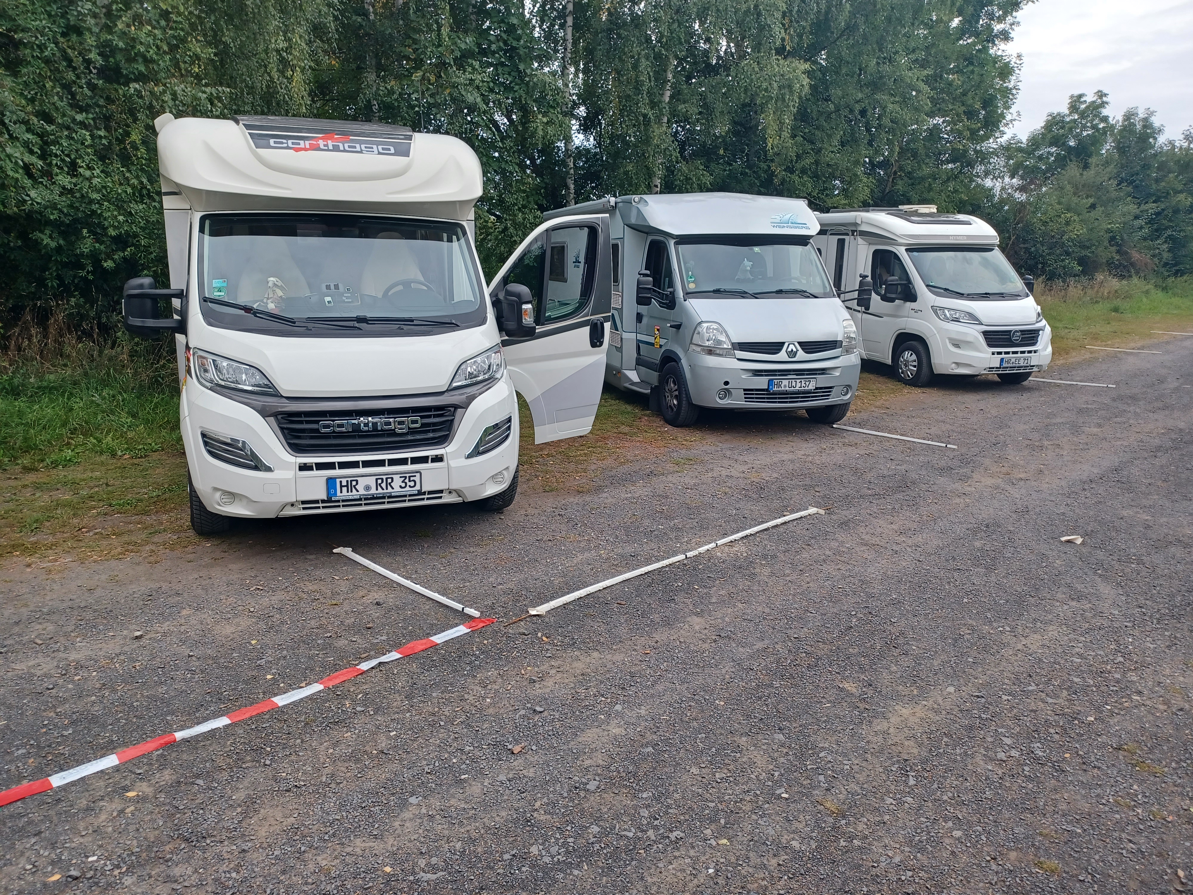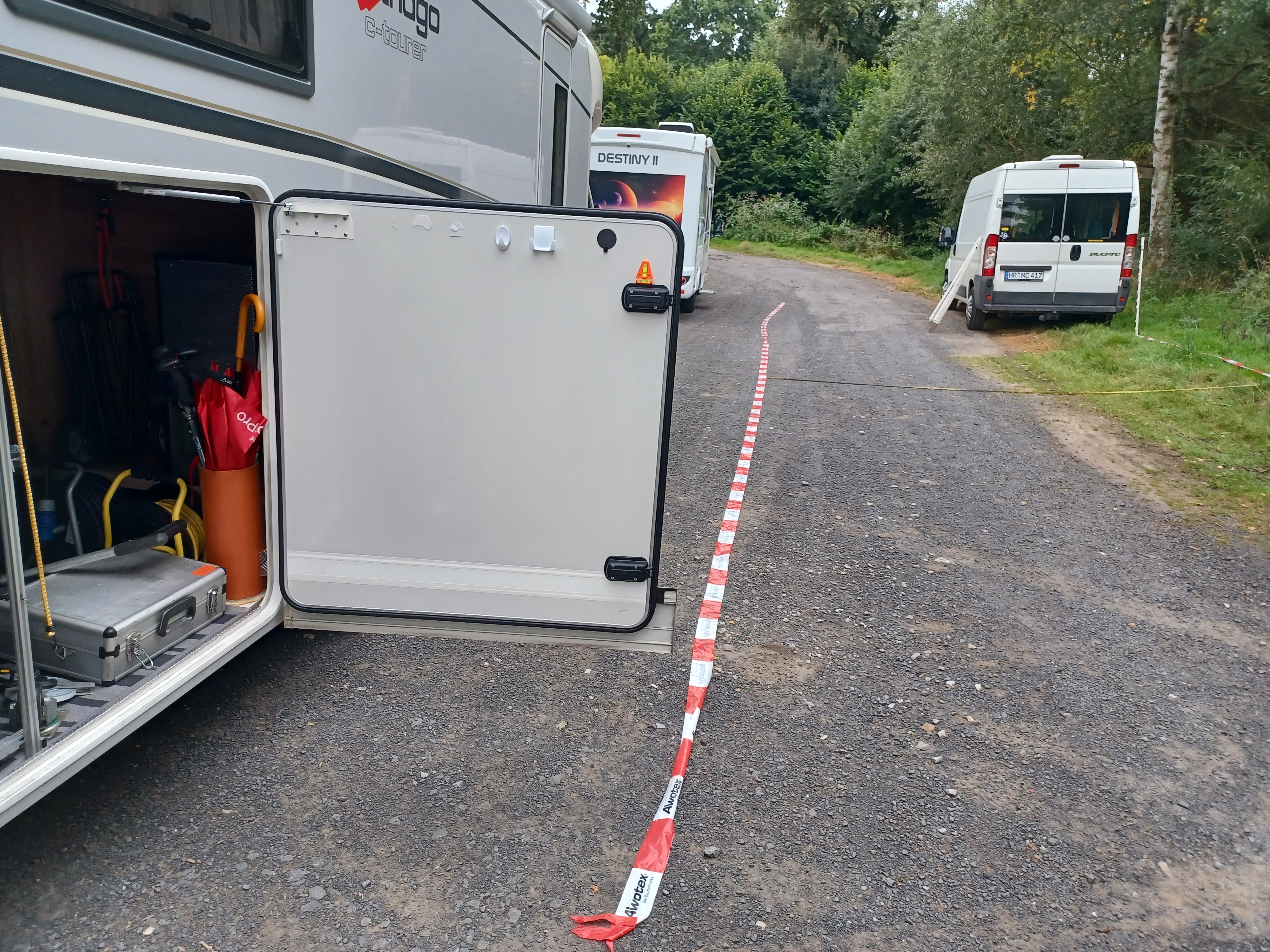 Auch hier weist das Sperrband den Fahrweg aus. Die weißen Stangen sollen den Abstand darstellen. Die Fahrzeuge können leicht eingeparkt und ausgeparkt werden. Die Markisen können wenn gewünscht ausgefahren werden, ohne ein anderes Wohnmobil zu behindern. Die Anzahl der Stellplätze hat sich nicht geändert.