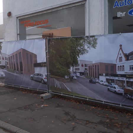 Fake: Bauzäune zeigen Häuser, die es nicht geben wird